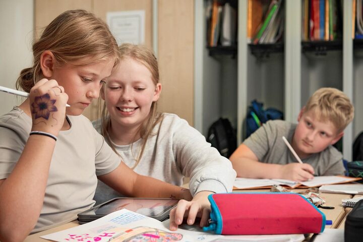 Zwei Schülerinnen und ein Schüler sitzen zusammen am Tisch und unterhalten sich